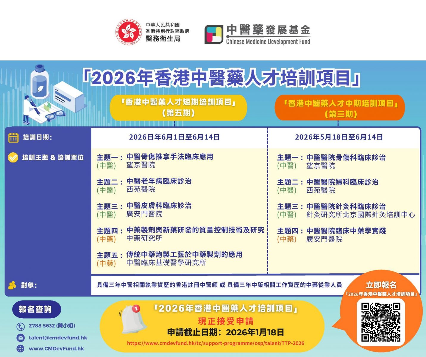 「2026年香港中醫藥人才培訓項目」的截止申請日期為 *1月18日,有興趣並具備3年或以上中醫藥工作經驗的香港註冊中醫師及中藥從業人員請把握機會,及早透過網上連結 https://www.cmdevfund.hk/....../osp/talent/TTP-2026 報名。