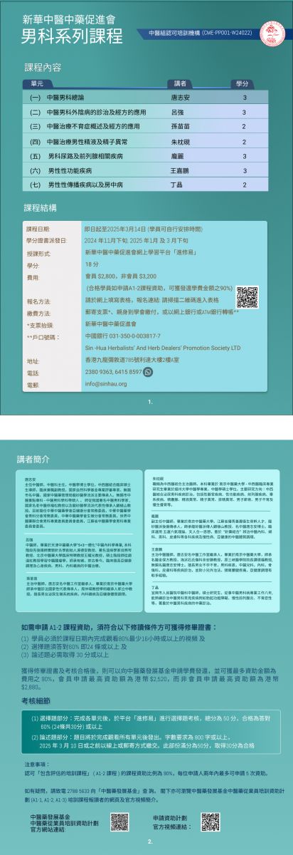 本課程介紹香港中醫在外地行醫的臨床體會及當地病案分享。課程分別三講,每一講費用為會員$150(合共$450)、非會員$200(合共$600),完成課程後可透過A1-3 一般進修課程計劃向中醫藥發展基金申請資助。