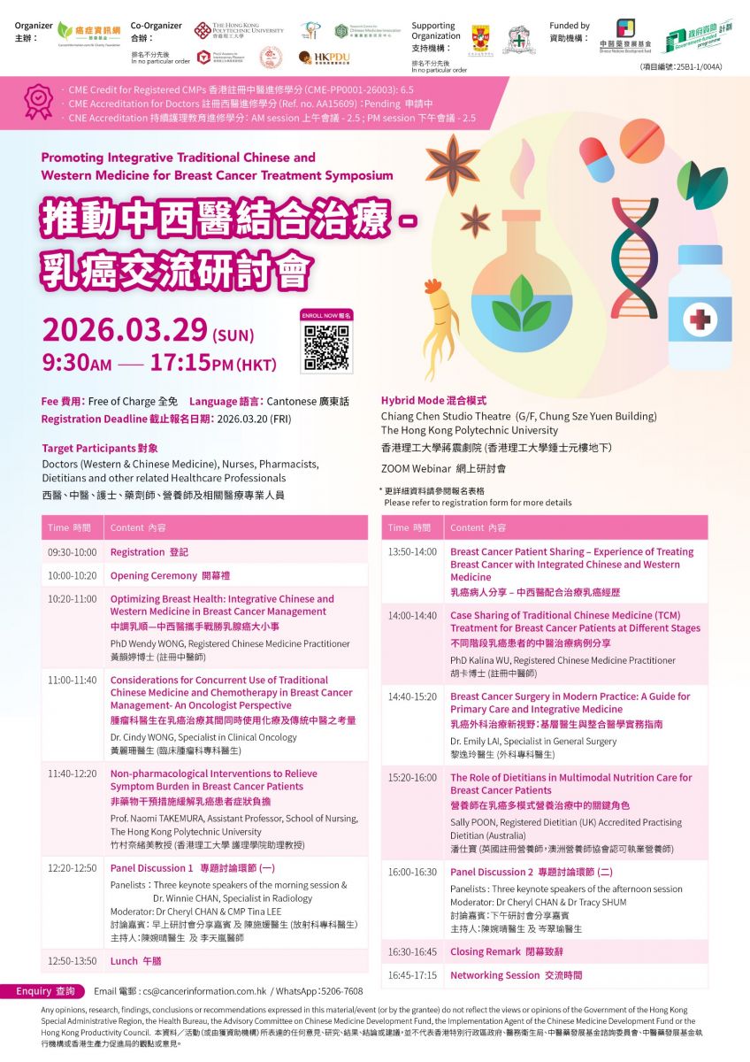 癌症資訊網慈善基金將於2026年3月29日 (星期日) 舉行「推動中西醫結合治療 – 乳癌交流研討會」。是次研討由中醫藥發展基金資助,旨在匯聚中醫、西醫、護士、藥劑師及營養師等專業人士,共同探討乳癌的最新治療策略與中西醫結合的臨床實踐。